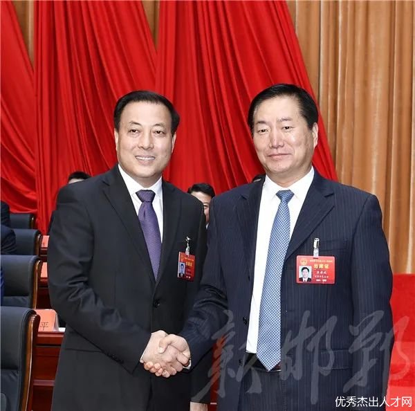 邯郸市十五届人大常委会主任崔永斌与新当选的市十六届人大常委会主任王进江(左)亲切握手